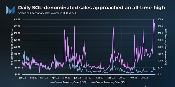 尽管在 FTX 破产影响下新的 NFT 数量有所下降,但 NFT 的销售活动仍相对保持了弹性。以 SOL 计价的每日销量在 12 月创下历史新高,因为持有者和交易员急于调整策略以应对 SOL 价格的暴跌。