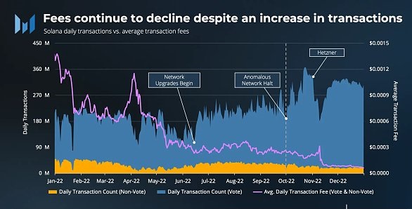 2022 年期间,网络的交易活动和性能波动不定,有时出于不同的原因。在前两个季度,网络性能受到 Gulfstream 引起的垃圾邮件的影响,Gulfstream 是 Solana 用于待处理交易的 mempool 替代方案。在第三季度末第四季度初,由于异常共识错误导致网络停止。最后, 服务方面的变化在 11 月初引发了一波交易波动。