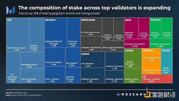 虽然分布在全球,但约 25% 的 Solana 验证者和约 20% 的质押量位于美国。「其他」位置占总验证者和权益的约 30%,包括超过 25 个不同的国家。