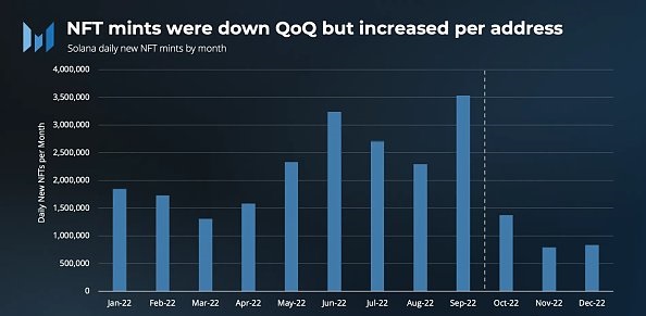 Solana 的 NFT 生态也经历了低迷,但不像 DeFi 那样剧烈,就像大多数其他网络一样。每日新增 NFT 总数首次环比下降,下降比例为 65%。然而,这种下降是在第三季度大幅飙升之后发生的。尽管铸造量环比下降,但,表明忠实用户正在出现。