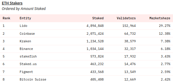 不久之后,出现了去中心化质押的解决方案。 后者提供了一个去中心化的验证节点网络。 在这些解决方案中,Lido 是做得最好的一个,事实上,Lido 是目前以太坊上主要的质押提供商。 该协议总共有 480 万个 ETH。 这大约占质押中存入的所有 ETH 的 29%。