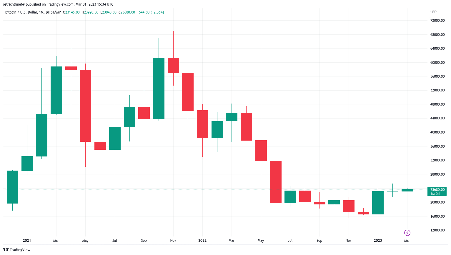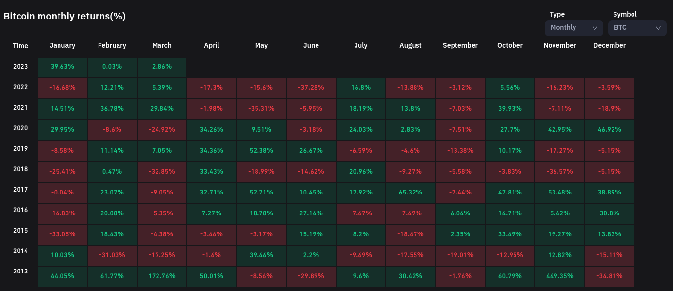 比特币月度回报率K线走势图(截图)。 资料来源:Coinglass 根据记录,根据 Cointelegraph Markets Pro 和 TradingView 的数据,3 月已经改变了趋势,在撰写本文时 BTC/USD 上涨了约 2.9%。
