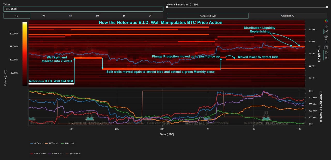 具体来说,在 币安上,这些“鲸鱼”创建了一个投标墙,成功地引导了监测资源 Material Indicators 称之为“被操纵”市场的现货价格行为。
