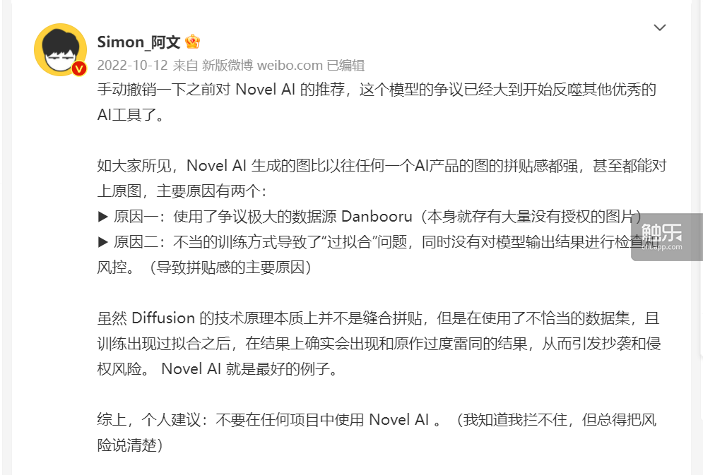 阿文那条AI绘画工具汇总停留在了9月底。从4月的兴高采烈到停止更新,阿文对AI绘画的态度也在发生变化。在10月初的一条微博中,他提到了为什么停止搬运最新的AI绘图工具Novel AI的相关消息:“这个模型的争议已经大到开始反噬其他优秀的AI工具了。”