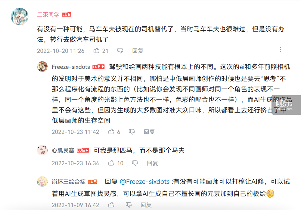 在阿豚的视频底下,有一条非常能代表大众态度的高赞评测:“你看别的手工艺人,有的人学了一辈子,好几代的手艺,一样被机器淘汰了,放平常心吧。”——这句话在未来的几个月间以各种形式不断被重复:手艺人和机器,马车夫和汽车,画师和AI绘画。大众以这样的比喻尝试去理解画师们的心情,但最终反而成了一场又一场新论战的导火索。