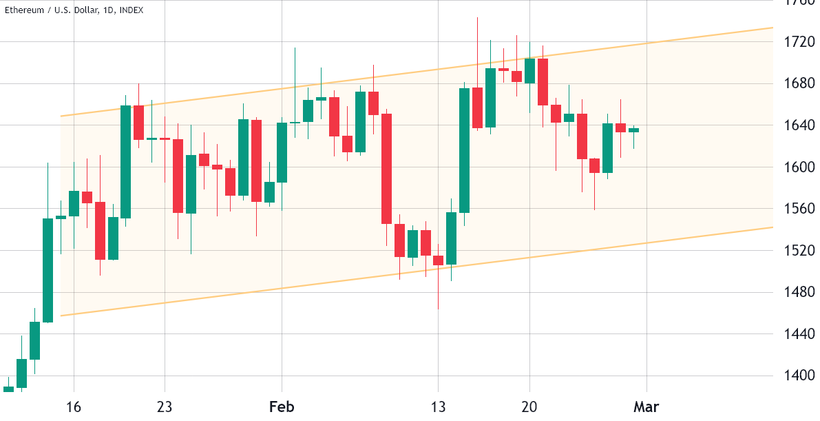 尽管存在一系列令人担忧的因素,但期权和期货市场表明专业交易员保守看涨,并相信上涨模式将会持续。 从技术分析的角度来看,投资者似乎认为除非以太币跌破通道支撑位 1,520 美元,否则看涨趋势将持续。