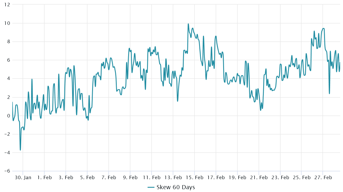 以太 60 天期权 25% delta 偏差:来源:Laevitas.ch 2 月 27 日,三角洲偏斜接近看跌的 9% 水平,表明来自专业交易员的压力。 然而,随着该指数升至 5,情况在 2 月 28 日有所改善——表明类似的上行和下行风险偏好。