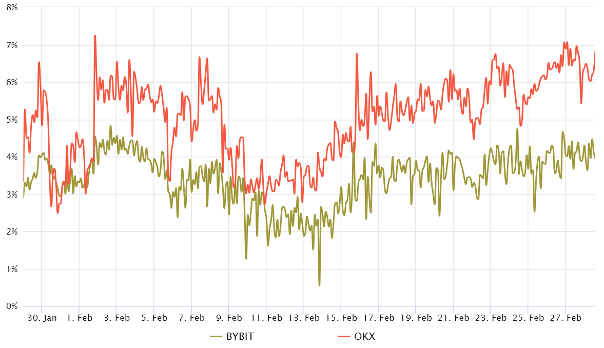 以太 2 个月期货年化溢价。 资料来源:Laevitas.ch 上图显示,随着以太期货溢价(平均)在 2 月 26 日触及 5% 的门槛,衍生品交易商变得略微看涨。更重要的是,即使以太价格在 2 月 19 日至 2 月期间下跌近 10%,它也显示出弹性2 月 25 日。