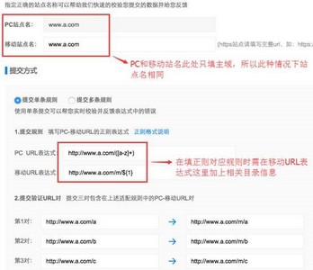 PC站点下开辟某个目录存放移动适配页面、作为移动适配“站”时,依然会有提交移动适配数据的需求,如:http://www.a.com/a.html 适配到http://www.a.com/m/a.html。虽然从长远角度看,这种行为对搜索引擎极不友好,百度(包括GOOGLE)一直不赞成不鼓励这种建方式。但为了满足该需求,百度站长平台移动适配工具依然提供满足此需求的功能。