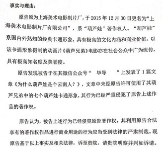 在@毕导张贴出来的起诉状截图当中我们可以看到,上海美术电影制片厂的起诉理由是: