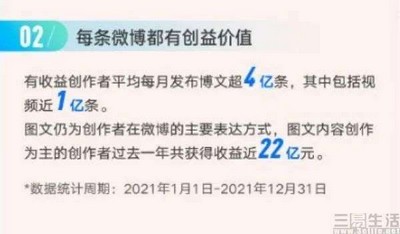 根据微博方面公布的《2021创作者收益报告》显示,2021年图文仍为用户在微博中的主要表达方式,而图文内容创作为主的用户在2021年共获得收益近22亿元。事实上,从这一数据就不难发现,用户对于付费图文内容的接受程度明显更高了。