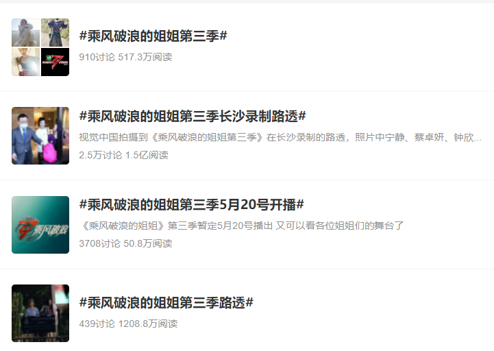 5月,《浪姐3》再次引爆全网。#宁静那英打起来##宁那贝儿##郑秀妍 二代团yyds##王心凌乘风破浪再唱爱你#等诸多“古早明星”名场面频频登上热搜,引得观众们纷纷陷入回忆。据芒果TV节目战报统计,《乘风破浪》连续两周霸榜热搜,其中包括日均98个全端热搜,和15个微博热搜。