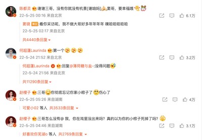 在这一则微博中,窦骁艾特了剧组相关的人员,并在反复修改三次之后,都没有艾特剧中饰演女二的赵樱子,为此,赵樱子在凌晨给窦骁留言两次,“三哥怎么没有@ 我,你在戏里没出来吗?真的以为你的小棕子死掉了吗?”、“三哥你彻底忘记你家小粽子了伤心了”,然而,窦骁并没有回她留言,也没有重新编辑加上她的艾特。