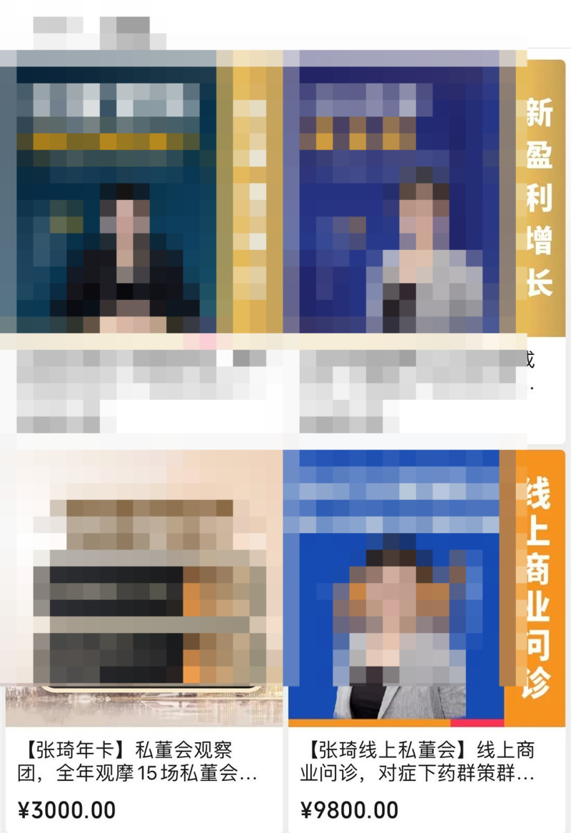 目前,张琦的商业课程有:600元的3天直播课、365元的录播课、3000元的全年私董会年卡门票、9800元的线上私董会问诊。