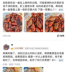 在一家小龙虾销量靠前的“永定门电烤串”店铺抖音评论区,有不少用户投诉“不干净,有黑泥”“每个小龙虾的肉都是黑色的,怀疑是死虾做的。”
