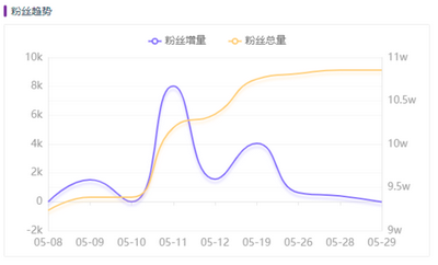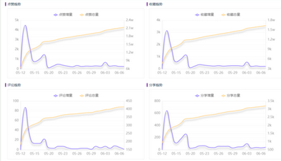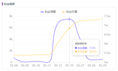 首先可以看到在近一个月中该品牌涨粉时间段在5.12-5.19这个时间区间中,且是在5.12这个节点粉丝量猛增,持续时间在10天左右。我们可以来看看在5.12这个时间点该品牌号输出了怎样的内容或者是爆文引起了账号的快速涨粉。
