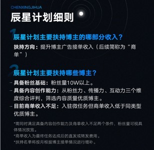 辰星扶持计划只是微博加大扶持的手段之一。根据“极点商业”了解,微博广告共享计划早已推出,主要针对博文、视频中腰部创作者,在博主个人主页投放效果广告,博主可以获得广告收益分成。