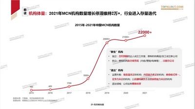根据克劳锐发布的报告,2021年MCN机构数量大约为22000家,比2019年增加了2000家。部分合约到期的达人成立工作室,部分机构高层、员工成立新公司,也有机构进行业务拆分,涌现许多“新生”机构。