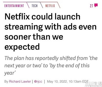 事实上。不只是国内市场视频网站的“日子不好过”,今年第一季度Netflix同样因为“订阅用户不升反降”的业绩表现、引发其股价在财报发布当日大幅下跌35%。尽管面对外界的关注,Netflix方面给出了“全球流媒体竞争加剧、战争、共享账号,以及全球化策略受当地基建影响”四个原因,但为了解决上述问题,其近期也已宣布,计划于年底推出低价广告订阅方案等寻求用户增量的举措,以及一改此前容忍的态度、开始打击共享用户,并针对家庭共享用户进行额外收费等提高营收的方式。