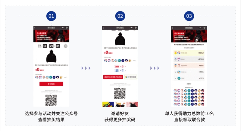 2018年底,李宁联名红旗推出“小程序独家联名限定款”服饰,首次尝试社交裂变玩法。在这场线上新品发布活动中,李宁采取头部激励策略,通过好友助力的形式激活粉丝,带动社交裂变。活动当日,小程序UV便突破10万。