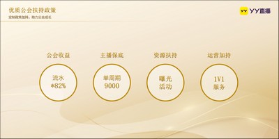 其中,“优质公会扶持政策”主要是针对外站(流水)百万规模的公会,入驻YY直播后最高能享受到82%的流水分成,且该分成持续时间长达半年。