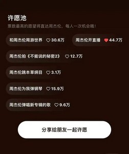 快手也为这次新专辑单独开了活动页面,设有一个“许愿池”环节,包含歌迷想要周杰伦实现的愿望,票数最高的一条将会直达周杰伦。