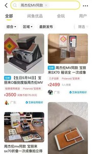 在闲鱼上,搜索“周杰伦MV同款”等关键词,能找到不少宝丽来sx70相机。这是先行曲MV中周杰伦使用的同款相机,MV上线之后一些卖家也火速将产品前加上了“周杰伦同款”的字样,贵一点的卖到八九千,便宜的也有三四千。