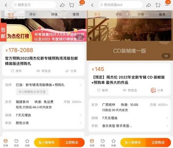 在微博有224万粉丝的“周杰伦资讯官方微博”就开了实体专辑的代购链接,单价178元一张,截至目前已经有超过3000人下单;淘宝店铺“沿海唱片Sea Music”的新专辑预定链接单价145元,目前已经有超过4000人下单。