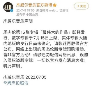 不过各种各样的链接也让许多粉丝难以分辨、无从下手。“杰威尔音乐”官方微博为此还特地发了声明提醒目前实体专辑的预购都不是官方活动,实体专辑大陆内地版的发行日尚未确定。