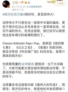 微博粉丝37.5万的乐评人“三石一声”形容这是“原汁原味的周杰伦”:Classic+Melodic Rap+ Pop,是典型《夜的第七章》、《以父之名》、《夜曲》的欧洲味,甚至还有些《布拉格广场》的风采在。