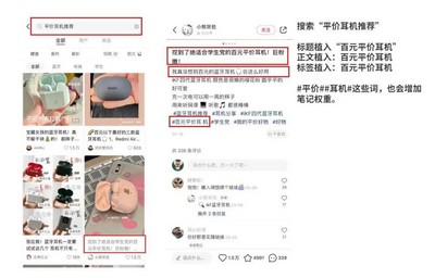 标题和标签一定要加上核心关键词,同时也要在正文中设置关键词,举例搜索平价耳机推荐,像这篇点赞评超1.9W的笔记,就植入百元耳机推荐关键词,也会增加搜索到笔记的概率。