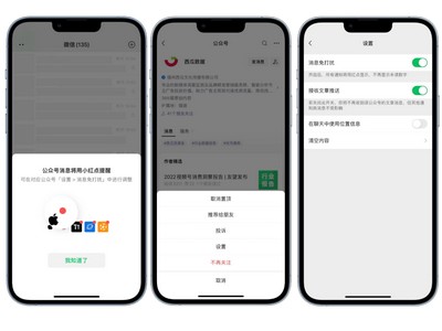 而在今年5月的微信for iosv8.0.22的更新中,服务号消息也全部默认一键免打扰了,公众号消息将用小红点提醒,若要开启提醒,需要用户到对应公众号的【设置-消息免打扰】中开启。