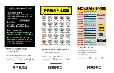 通常一些信息量大的封面,用户只有点开后才能看到,比如以下封面,女生在小红书做什么内容、骨灰级买车流程图和小红书爆火的15个赛道,这些都需要点开之后,才能看清,就是利用知识性好奇心。