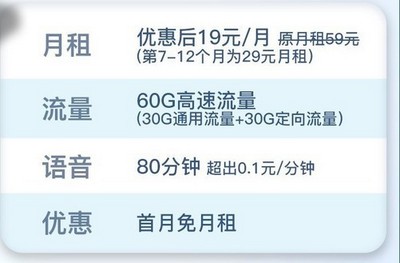 每月19元的套餐中就有很多不错的优惠活动,现在办理的每月60G中通用流量达到了30G,而且还有30G的定向流量,还送200分钟通话,而且首月还免月租费!