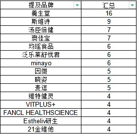 我们整理了保健品爆文top300中品牌提及数大于3的一些品牌,其中前四分别是养生堂、斯维诗、汤臣倍健和澳佳宝。说明现在小红书中这几个品牌有一定的影响力和市场,也是现在大家比较熟悉的品牌。对于这几个品牌我们可以去学习他们是如何投放笔记的。