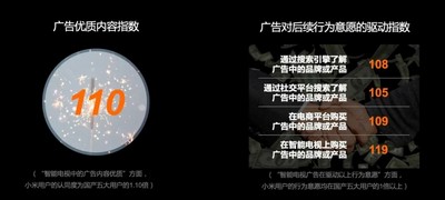 在报告中,凯度根据对消费者的调研,形成了广告优质内容指数、广告对后续行为意愿的驱动指数等指标。在广告内容优质方面,小米电视用户的认同度为其他五大国产厂商用户的1.10倍;在驱动用户后续行为意愿方面,小米电视用户的行为意愿也均在其他五大国产厂商用户的1倍以上。用户认知和认可度高,足以证明小米OTT较强的用户粘度和聚合引力。