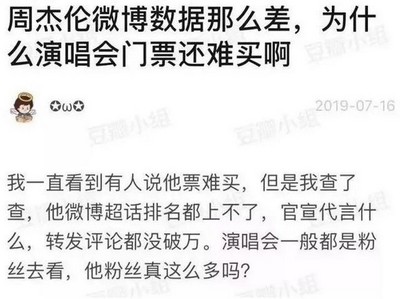 周杰伦的无可取代不仅是在华语乐坛。2019年,偶像市场繁荣,饭圈文化干劲十足,各类饭圈打投榜单中,周杰伦的名字也早已被流量“超越”。彼时有豆瓣网友发帖质疑:《周杰伦微博数据那么差,为什么他演唱会的票还那么难买啊》,一石激起千层浪,这一帖迅速激起全民打榜浪潮:3天时间送周杰伦上微博超话前五,5天时间,送周杰伦上了超话第一。