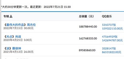 再将钟往反方向拨去,专辑在7月14晚提前释出后不到一小时,在QQ音乐总销售破亿。截至发稿前(7月21日),新专辑《最伟大的作品》销量超629万,销售额超1.88亿,位于数字专辑销量及销售额双榜首。创下蔡徐坤专辑《迷》344万张的销量纪录、肖战单曲《光点》1.62亿销售额纪录。网友戏称其为《最赚钱的作品》。