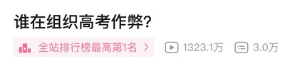 这条题为“谁在组织高考作弊”的视频自发布后播放量陡增,目前累计播放量1323.1万,视频曾冲上B站排行榜第一。新站数据显示,“衣戈猜想”在今年6月B站涨粉近27万,很大的功劳可能都要归功于这条视频。