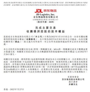 昨日下午,京东物流发布公告称,收购德邦控股的股本权益相关交易完成。相关交易完成后,德邦控股将成为本公司的附属公司。