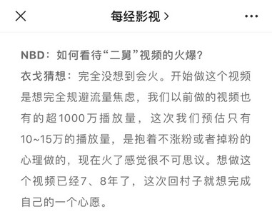 就比如他最开始定的标题是《我的二舅》,但最后一刻又动摇了,改成了现在的标题,因为“流量焦虑又起来了”。
