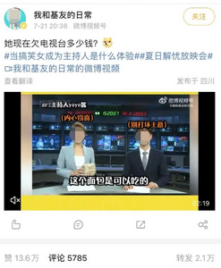 传统主持人“正襟危坐”和yoyo“不拘小节”的对比营造出了强烈的反差感,她的视频像是传统电视台中难以想见和公开的画面,大家乐此不疲地猜着yoyo究竟有没有被扣钱,是不是“贷款上班”,到底哪些视频是真的花絮,哪些视频是艺术创作,仿佛yoyo已经成了他们日常生活中的一份子,电视台主持人也不再是那个西装革履的“神秘人”,而是变得更加亲近与自然。