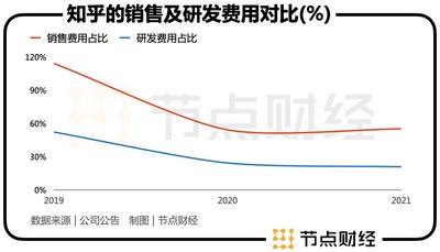 2021年,知乎的销售费用为16.35亿元,约是研发费用的2.6倍。在2019年-2021年,知乎的研发费用占比一直低于营销费用。