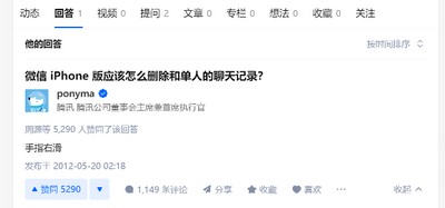 一年之后,另一位网友不知道iOS版微信应该怎么删除和单人的聊天记录,所以选择提问求助。帮助他解决问题的是腾讯创始人、CEO马化腾,他在这个问题的下面写下了答案-手指右滑。