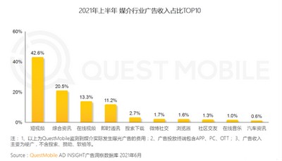 不过,细究之下,这个结果也受到了其他因素的干扰。比如,来自其他平台的竞争。据QM2021年上半年的数据显示,短视频已成为各类媒介中占广告主投放最大的品类,占有率高达42.6%,是综合资讯类的2.1倍。