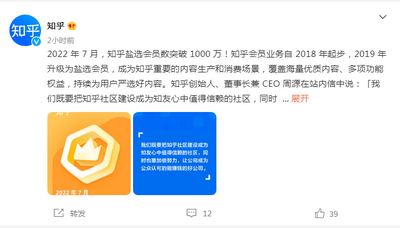 知乎表示,知乎会员业务自2018年起步,2019年升级为盐选会员,成为知乎重要的内容生产和消费场景,覆盖海量优质内容、多项功能权益,持续为用户严选好内容。