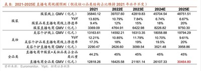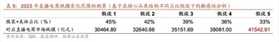 综上,招商证券基于这两大品类未来的线上化率、直播电商的销售占比、两大品类直播电商线上市占率进行假设,对2025年直播电商的规模进行测算。