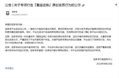 百家号打击星座运势原创变质行为 封禁80家MCN机构