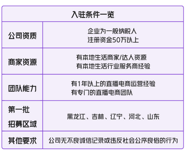 值得注意的是,第一批招募区域包括:黑龙江、吉林、辽宁、河北、山东。入驻报名需满足以下条件: