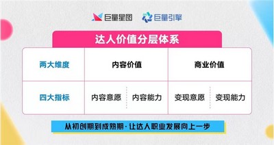 那么达人如何衡量自身价值、了解自身的职业发展状态?仅仅以粉丝数量作为考量标准显然是片面的。在达人节上,巨量星图以职业化道路为目标,发布达人价值分层体系和成长扶持体系。其中「达人价值分层体系」,在内容价值和商业价值两个维度下划分出了四大细分指标:内容意愿及能力、变现意愿及能力。